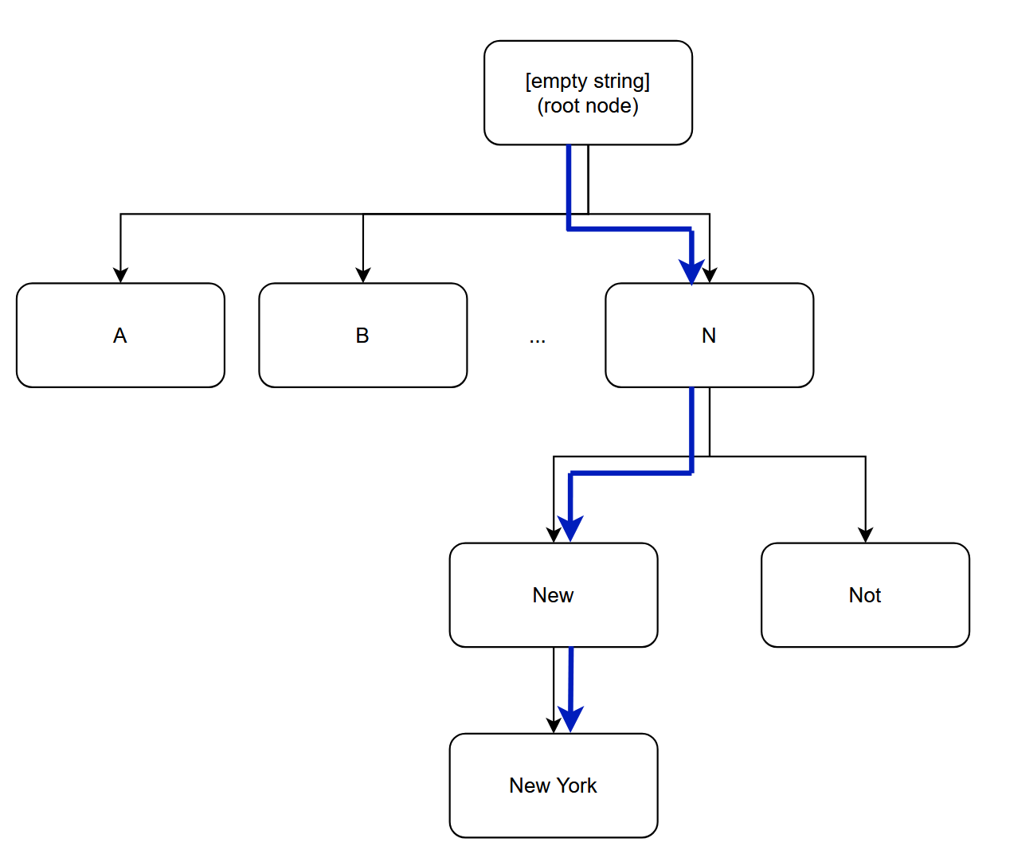 To make this approach even more efficient, it is sufficient to make each child node a continuation of the parent node where ’New’ is a continuation of ’N’. Then, as we natrually iterate through the caracters of the text, we can check whether a longer token is possible in the text (providing accuracy through assumption 2) or whether the text differs from the provided continuations which marks the end of the token (providing accuracy through assuption 1). The following figure illustrates an example of this so called Token Tree approach for tokenizing the word ’New York’ (part of the llama3 vocabulary):