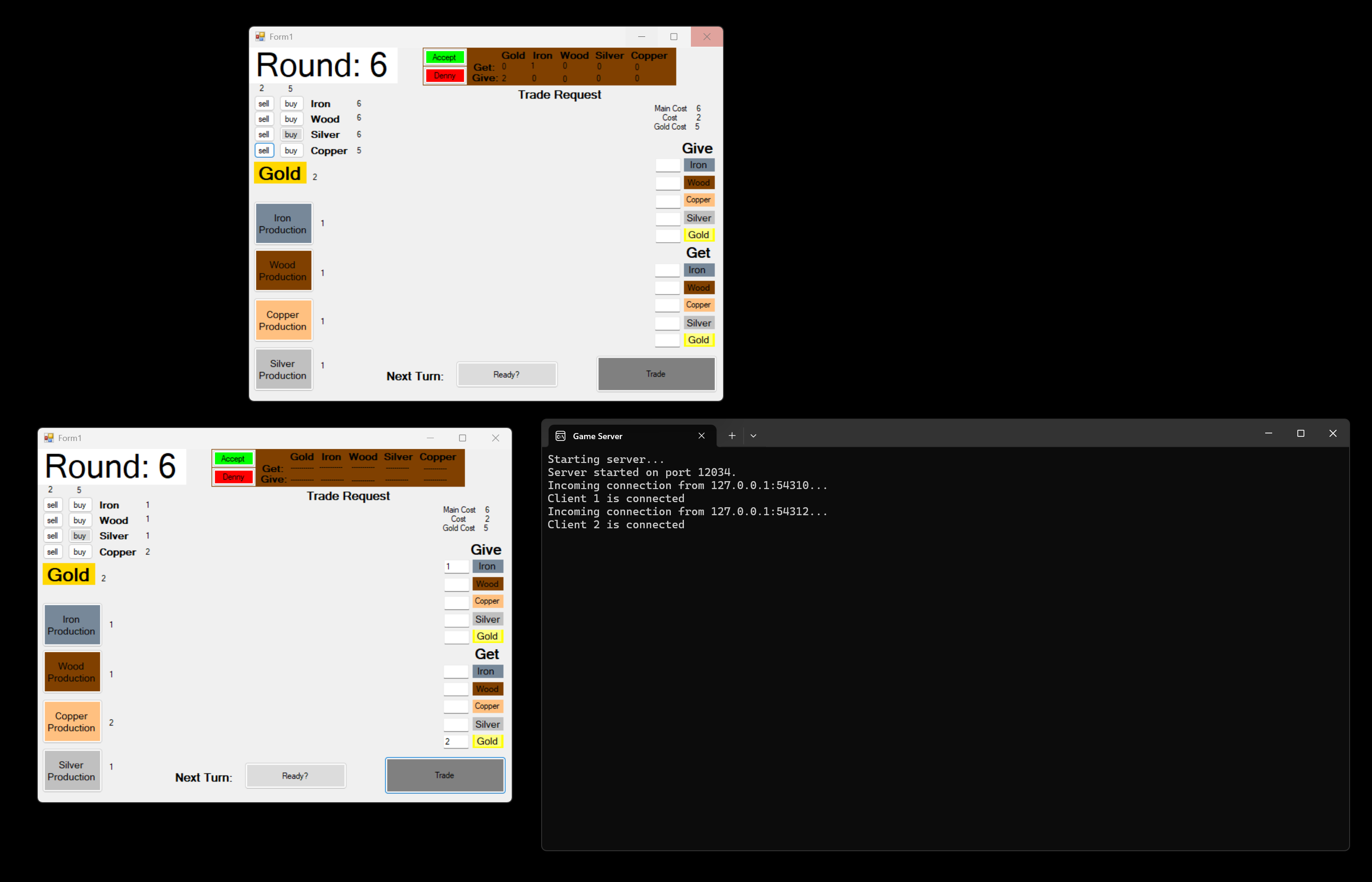 This was a multiplayer network simulator, playable on a LAN. The players could connect to a server. The players could trade resources in each round. The players also received resources in each round. Resources could be traded in for money called coins. The goal of the game was to reach 100 coins first. Resources could be also be used to upgrade resource acquisition capability.
