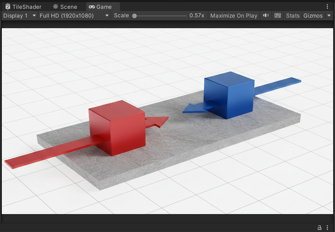 Two playes coud play against each orther. Two cubes could be controlled, one with arrow keys, the other with WASD. They could push each other around. The surface of the playing field had a simulated friction, the cubes were heavy. The goal of the game was to build up momentum. High momentum made it possible to push the opponent out from the playing field.