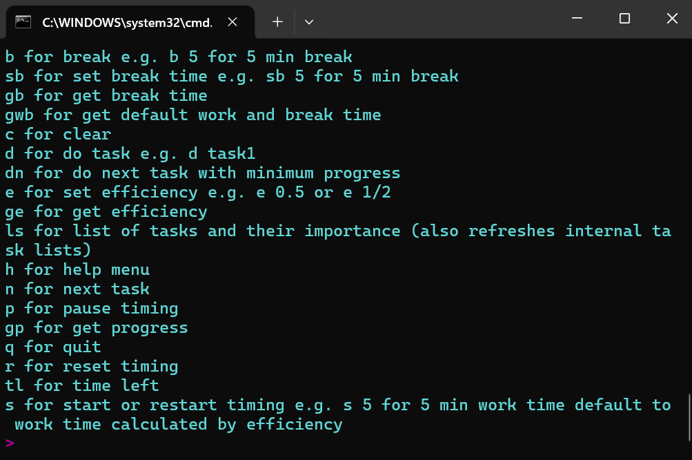 WeekPlanner is a simple, terminal-based task management and pomodoro-style productivity tool written in Python. It helps you manage tasks with importance levels, tracks progress, and uses an efficiency-based work/break ratio to structure your time.